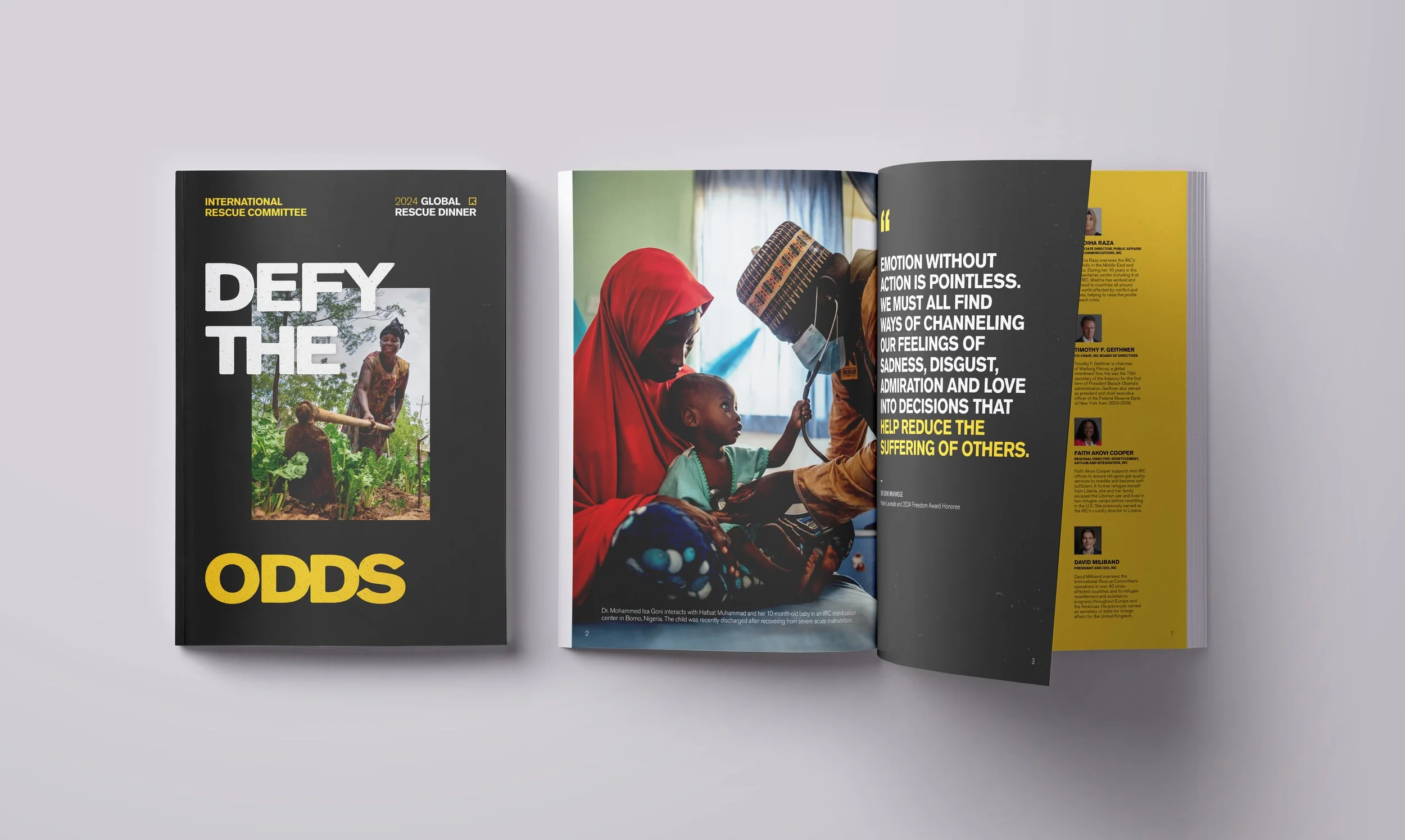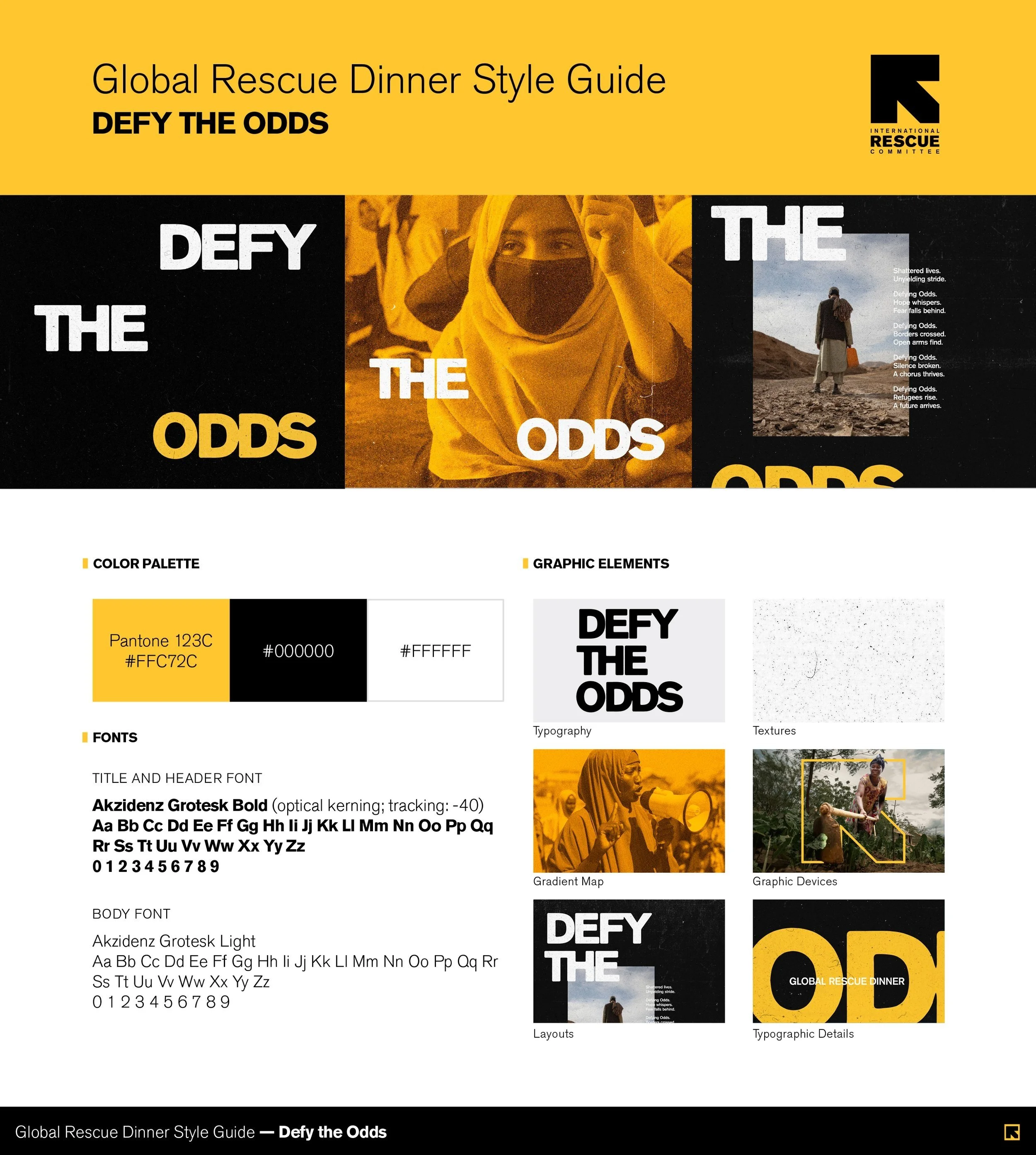 This guide served as the launchpad for crafting all Global Rescue Dinner materials. The goal was to be as consistent as possible in capturing the IRC’s grit, determination, and unwavering spirit, all while embodying the unique look and feel of the 2024 campaign theme: Defy the Odds.