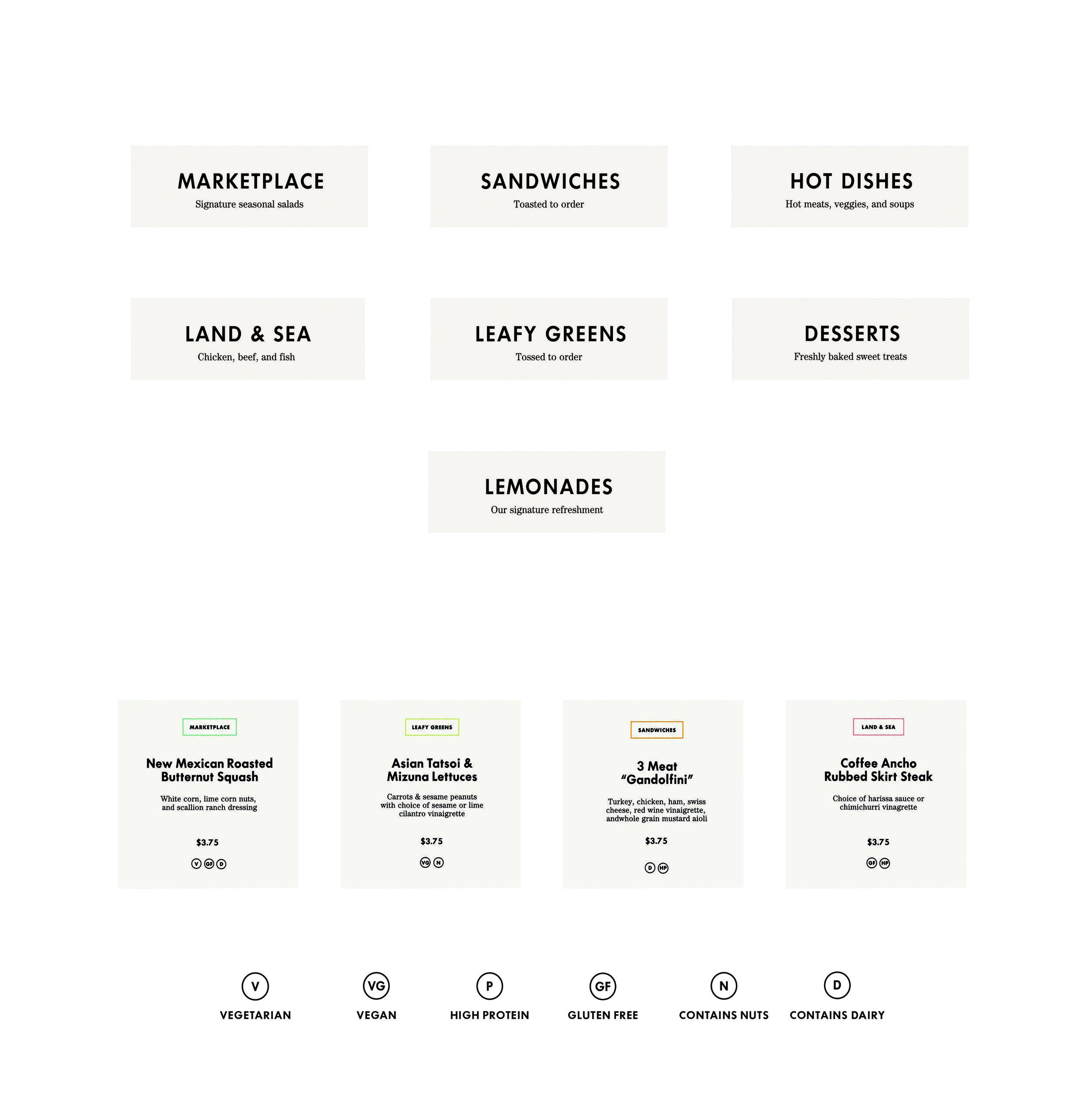 All menus were designed with edge painting to help differentiate the various food options and categories as people move from one station to another and select their food. A simple typographic icon system was also designed to indicate food restrictions and dietary preferences associated with various food options.