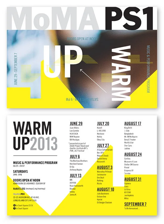 Promotional postcard for the series of summer “Warm Up” events at MoMA PS1. Designed while working at MoMA’s in-house design studio in New York.